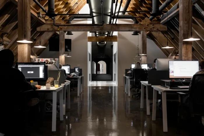 除了解决狭窄、局促和线性空间的问题,ACDF在重新设计传统建筑时还面临着一些固有的限制,包括监管问题。为了满足紧急出口的要求,该公司为6楼会议室建造了一个新的疏散走廊,穿过暴露的阁楼木结构,以连接到现有的出口。进一步的挑战涉及到与基地建筑建筑师合作开发的外部屋顶保温策略,允许裸露的屋顶内部木梁保持空间设计的一部分。该公司还以一种创新的方式,通过设计和实施环境照明策略,解决了自然光渗透受限的问题。